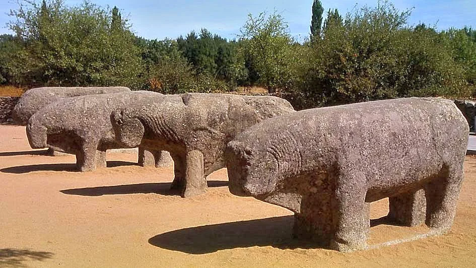 The Bulls of Guisando are attributed to the Vettones and date back to the 3rd century BC. They consist of four granite sculptures representing four-footed animals, believed to be bulls or boars, and are considered to have a magic-religious function to aid fertility or protect livestock. An alternative theory is that they were used to mark the boundaries of pastureland.